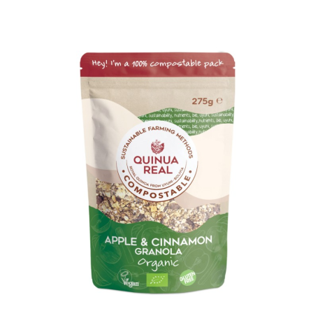 Granola de manza y canela crujiente, rica en fibra, ideal para combinar con tu bebida vegetal preferida. Su textura recuerda a la auténtica granola elaborada a mano pero dulcificada con sirope de arroz. Certificada como Gluten Free y Vegan. En envase 100% compostable, para reciclar directamente en el contenedor orgánico y volver a la naturaleza en forma de abono.