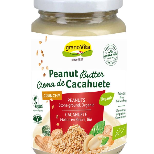 Deliciosa crema de cacahuete crujiente para untar Granovita, se fabrica en molino de piedra con cacahuetes ecológicos cuidadosamente seleccionados. Este método mantiene los nurientes y sabores naturales de los frutos secos aportando una textura cremosa.