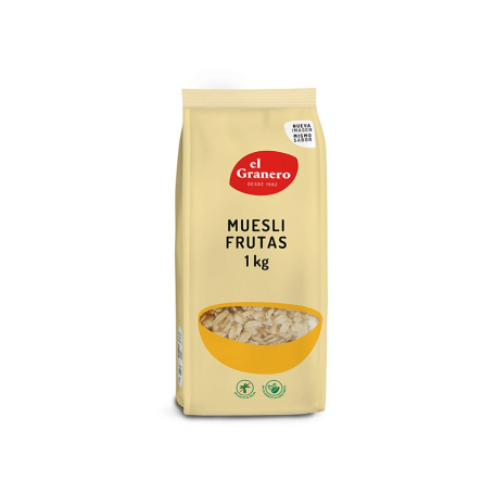 MUESLI DE FRUTAS en envase de 1 KG con la calidad de el Granero. Con abundante fruta y semillas. Rico en fibra, proteinas y antioxidantes.