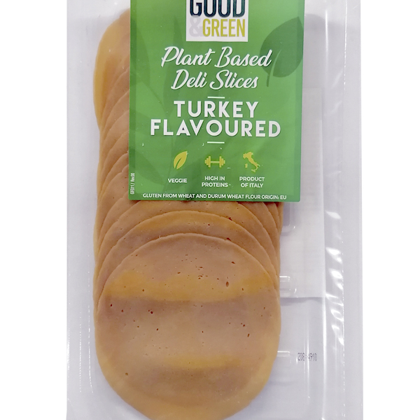 NUEVO Pavo Vegano en lonchas. Envase de 90 Gramos. Un producto de Good Green.