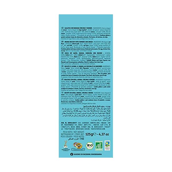 Ingredientes: Harina integral de AVENA*, Harina integral de TRIGO ESPELTA*,almidon de tapioca*, azúcar de caña*, aceite de oliva virgen extra*, bebida de AVENA*, curcuma*,fibra de AVENA*,jengibre*, aceite esencial de naranja*, gasificante : bicarbonato sodico, aromas naturales*,