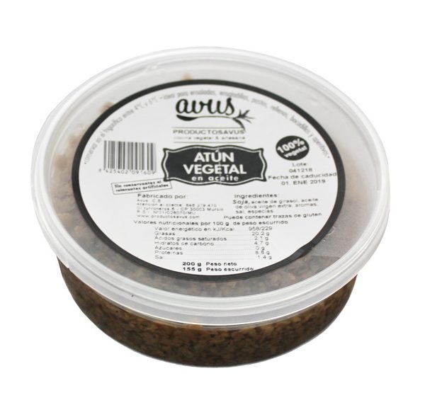 Atún Vegano en Lata. Lata de 200 Gr. con la calidad Avus. En realidad es una tarrina, pero cómo coloquialmente se conoce cómo «Atun en lata» por eso la definición.