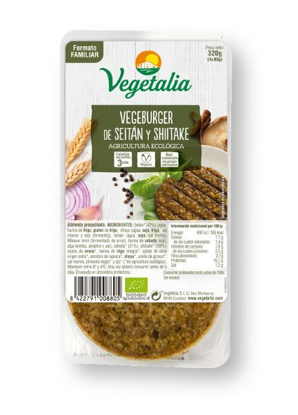 Vegeburguer de Seitan y Shiitake de Vegetalia producto fresco elaborado con una rica combinación de ingredientes para comer sano. Proteína vegetal precocinada.