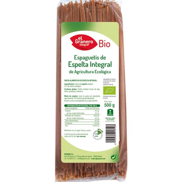 Espaguetis de Espelta Integral Bio de El Granero Integral es un producto de alta calidad elaborado a base de sémola integral de espelta 100 % ecológico.