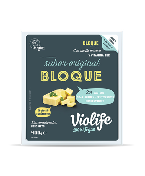 Queso Vegano de Violife en bloque de 400 gramos. Violife es la alternativa perfecta a los que buscan un queso libre de leche, sin lactosa ni maltrato animal. Violife original es el auténtico queso veggie.