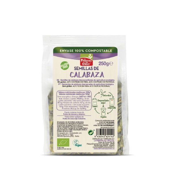 Semillas de calabaza peladas procedentes de agricultura ecológica. Ricas en ácidos grasos, fibra y proteínas son ideales para enriquecer cualquier plato o utilizar en panes y galletas. Envasado en atmósfera protegida para conservar todos sus nutrientes. Gluten free. ¡Ahora en envase 100% compostable!